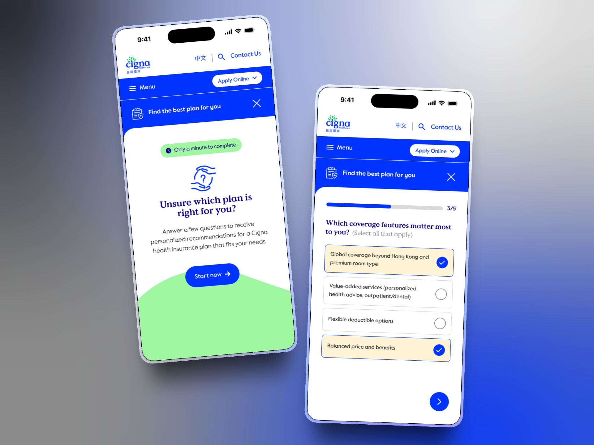 Personalized recommendations begin with understanding. A structured, step-by-step questionnaire surfaces customer needs—matching them to the right Cigna product without friction.